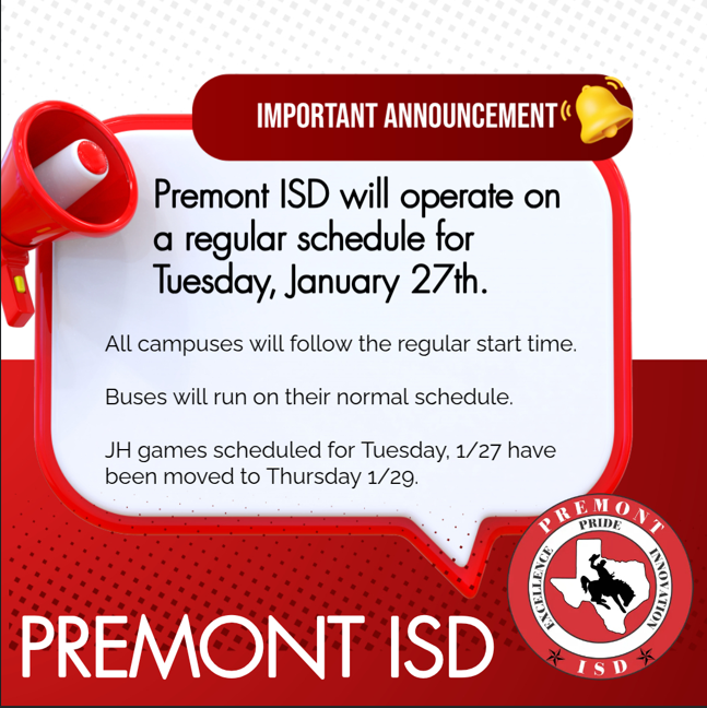 Premont ISD is closely monitoring the upcoming winter weather. Student and staff safety is our first priority. Please keep a close watch on Parent Square, District Website and our Facebook page for...